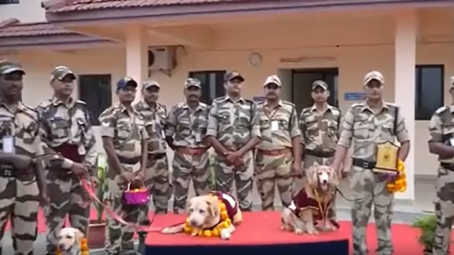 कोच्चि: केरल में करीब 10 साल की सर्विस के बाद CISF के 2 डॉग रिटायर हो गए हैं। इन दोनों को कोच्चि एयरपोर्ट पर जवानों ने विदाई दी है। इस पूरे मामले से जुड़ा एक वीडियो भी सामने आया है। इसमें देखा जा सकता है कि अधिकारी इन दोनों डॉग्स को माला पहनाकर उनका सम्मान कर रहे हैं। इसके अलावा दोनों डॉग्स को मेडल भी दिया गया है। इस दौरान CISF के जवानों समेत सीनियर अधिकारी भी मौजूद रहे।