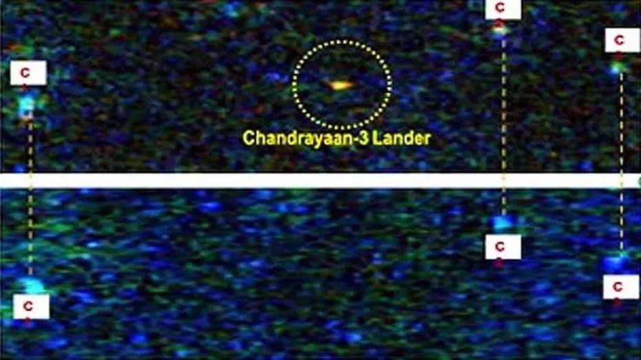 ISRO ने चंद्रयान 3 के लैंडर की तस्वीर जारी की है। इसरो ने यह नई तस्वीर सोशल मीडिया साइट एक्स पर जारी की है। इसमें बताया गया है कि यह फोटो विक्रम लैंडर की है। इसे चंद्रयान-2 के ऑर्बिटर में डुअल-फ्रीक्वेंसी सिंथेटिक एपर्चर रडार ने 6 सितंबर 2023 को लिया है। इसरो ने तस्वीर को शेयर करते हुए लिखा कि चांद पर पड़ रही भयंकर ठंड को विक्रम लैंडर और प्रज्ञान रोवर सह लेंगे। 22 सितंबर के बाद जब चांद की सतह पर सूर्य की रोशनी पहुंचेगी तो वे फिर से काम करना शुरू कर देंगे। चंद्रयान 3 की तस्वीर चंद्रयान 2 ऑर्बिटर द्वारा ली गई है। चंद्रयान-3 का विक्रम लैंडर सोमवार को स्लीप मोड में चला गया था।