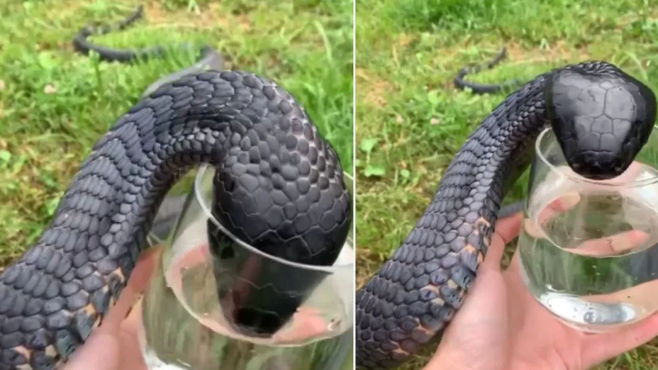 इस वीडियो को एक इंस्टाग्राम हैंडल द ब्यूटीफुलशॉर्ट्स ने शेयर किया है। वीडियो में देखा जा सकता है कि कांच के एक ग्लास में डार्क ब्लैक कलर का कोबरा पानी पी रहा है।