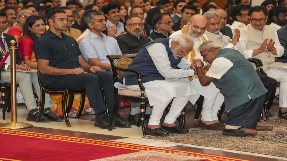 राजन्ना सम्मान लेने के लिए जाते समय पीएम मोदी और शाह का अभिवादन करने भी गए। पीएम मोदी का हाथ थामे राजन्ना कुछ कहते भी दिखे। चंद सेकेंड की यह मुलाकात देखने वाले लोगों को भावुक कर रही है। पीएम मोदी से मुलाकात के बाद जब राजन्ना राष्ट्रपति के आसन की तरफ बढ़े तब वहां भी उन्होंने शीश नवाकर मंच को प्रणाम किया। मंच पर राजन्ना ने अपनी ललाट झुकाई और मंच को प्रणाम किया। जब राजन्ना को सम्मानित किया गया तो समारोह में उपस्थित गणमान्य व्यक्ति और अतिथि लगातार तालियां बजाते रहे।