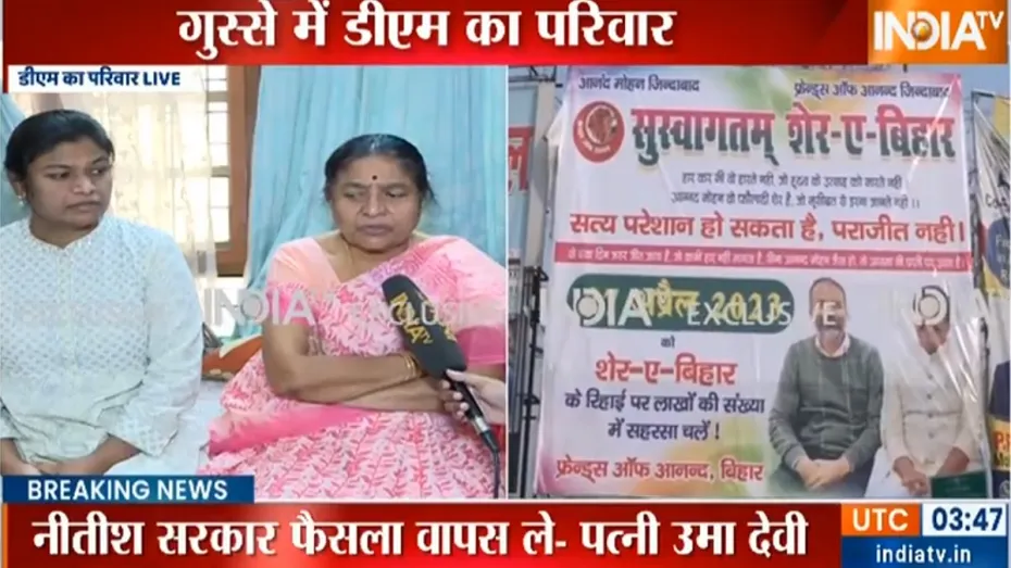 नयी दिल्ली: पूर्व सांसद और बाहुबली नेता आनंद मोहन की सहरसा जेल से रिहाई के बाद गोपालगंज के डीएम रहे जी कृष्णैय्या के परिवार की तरफ से पहला बयान है। उनकी पत्नी उमा देवी और बेटी निहारिका ने इंडिया टीवी के साथ करते हुए बिहार सरकार के इस फैसले की आलोचना की है। उन्होंने प्रधानमंत्री और राष्ट्रपति से इस मामले में दखल देने की अपील की है। गोपालगंज के डीएम की हत्या के आरोप में आनंद मोहन को उम्रकैद की सजा हुई थी लेकिन बिहार सरकार ने नियमों को बदलते हुए आज सुबह आनंद मोहन को रिहा कर दिया।