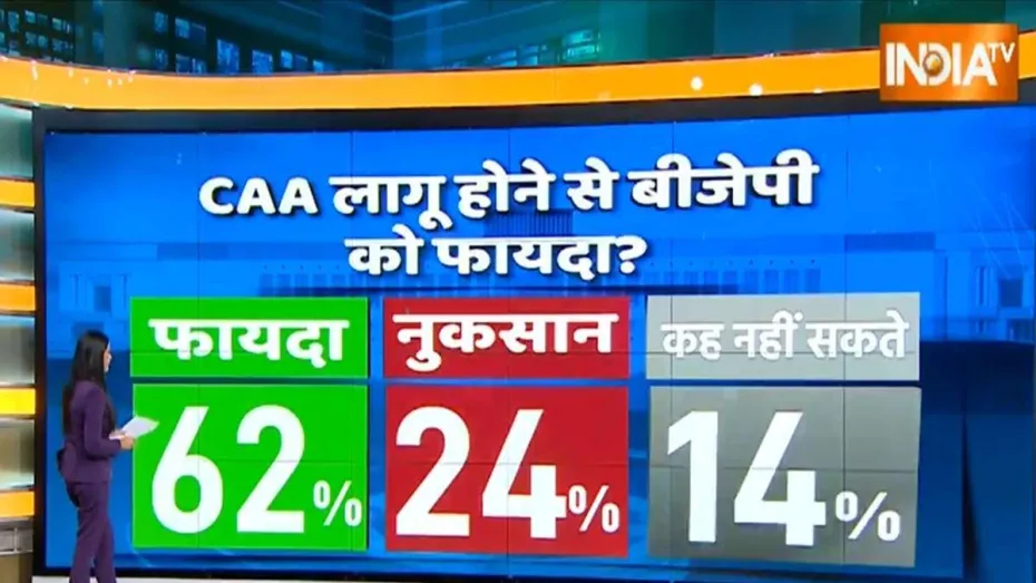 इंडिया टीवी-CNX के ओपिनियन पोल में 62 प्रतिशत लोगों का मानना है कि सीएए लागू होने से बीजेपी को चुनावी फायदा मिलेगा। 24 फीसदी ऐसे लोग भी हैं जिन्होंने कहा कि चुनाव में बीजेपी को इसका कोई लाभ मिलने वाला नहीं है। क्योंकि भारतीय नागरिकता मिलने और वोटर आईडी कार्ड बनवाने में समय लगेगा। जब शरणार्थी वोटर बनेंगे तभी इसका लाभ बीजेपी को मिल सकता है। वहीं, 14 प्रतिशत लोगों ने कहा कि वो कह नहीं सकते किसको फायदा मिलेगा किसको नहीं।