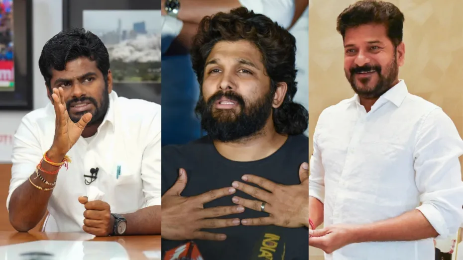 तेलुगु फिल्मों के सुपरस्टार अल्लू अर्जुन को लेकर अब राजनीति गरमाने लगी है। थिएटर में भगदड़ और एक महिला की मौत की घटना को लेकर अल्लू अर्जुन और तेलंगाना के मुख्यमंत्री रेवंत रेड्डी आमने-सामने हैं। इस मामले में पुलिस ने मंगलवार को अल्लू अर्जुन से तीन घंटे तक पूछताछ की है। बता दें कि इससे पहले अल्लू अर्जुन के आवास पर हमला पर भी किया गया है। वहीं, अब तमिलनाडु बीजेपी के अध्यक्ष के. अन्नामलाई ने पूरे मामले में अभिनेता अल्लू अर्जुन का समर्थन किया है और तेलंगाना के मुख्यमंत्री रेवंत रेड्डी पर जमकर निशाना साधा है।