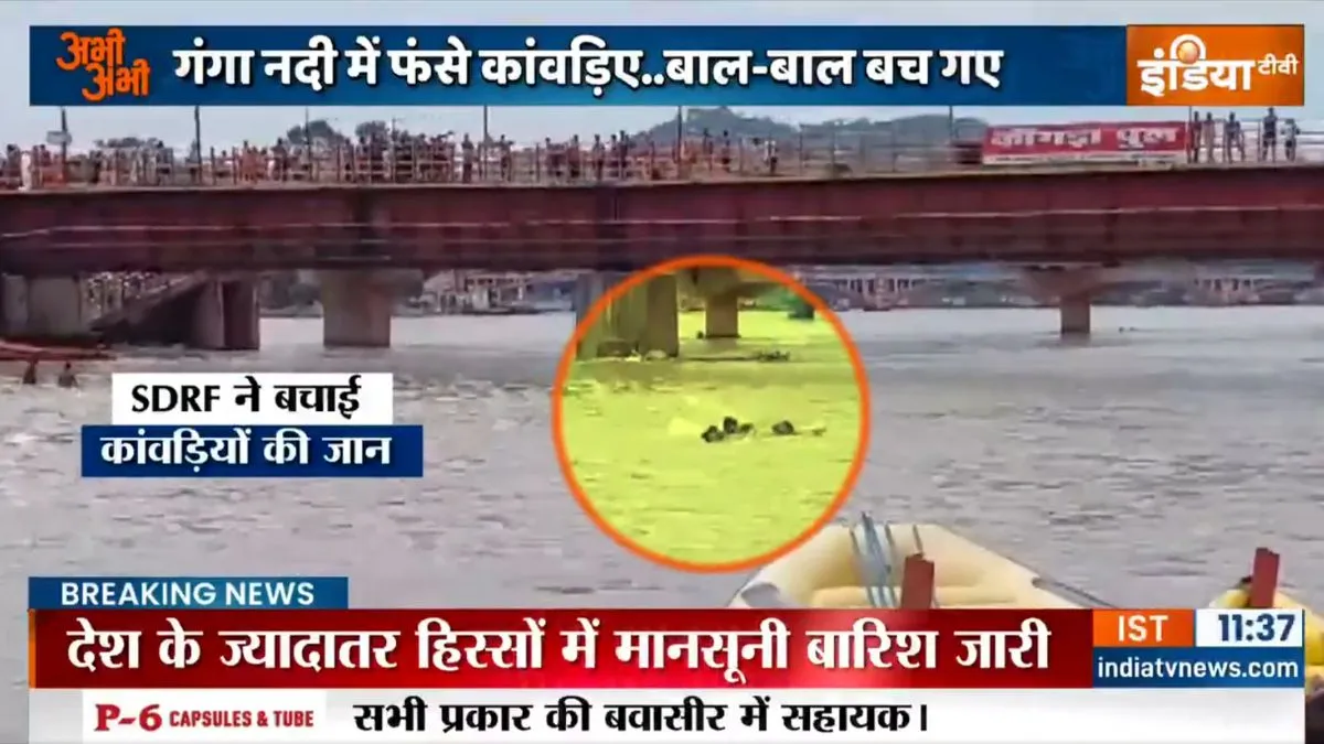 पूरा मामला हरिद्वार के प्रेम नगर घाट और कांगड़ा घाट का है। यहां जल लेने गए कांवड़िये गंगा नदी की तेज धारा में फंस गए। हालांकि इन कावंडियों के लिए घाट के आस-पास तैनात SDRF देवदूत बनकर आई। SDRF ने बड़ी मुस्तैदी से इन कांवड़ियों की जान बचाई। उत्तराखंड की स्टेट डिजास्टर रिस्पॉन्स फोर्स ने अपनी सतर्कता और बहादुरी से इन कांवड़ियों की जान बचाई है। SDRF की टीमें गंगा के तेज बहाव में फंसे कांवड़ियों को सुरक्षित निकालने में कामयाब रहीं। घटना का वीडियो सामने आया है, जिसमें SDRF के जवान नदी में डूब रहे कांवड़ियों को सुरक्षित बाहर निकालते नजर आ रहे हैं।