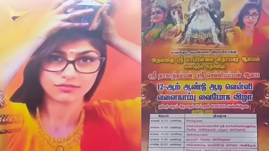 पूरा मामला तमिलनाडु के कांचीपुरम जिले का है। यहां 'आडी उत्सव' के दौरान एक धार्मिक होर्डिंग में मिया खलीफा की तस्वीर ने सनसनी मचा दी है। यह होर्डिंग देवी अम्मन (मां पार्वती) की पूजा के लिए लगाया गया था, जो तमिलनाडु के विभिन्न मंदिरों में बड़े धूमधाम से मनाया जाता है। हर गांव में हजारों लोगों की उपस्थिति के साथ इस त्योहार का आयोजन कई दिनों तक चलता है। वहीं इस त्योहार के दौरान इस तरह की घटना पर लोगों ने भारी आक्रोश जताया। हालांकि घटना के सामने आते ही पुलिस ने इस विवादित पोस्टर को तत्काल हटवा दिया।