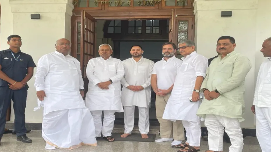 बिहार के मुख्यमंत्री नीतीश कुमार इन दिनों दिल्ली दौरे पर हैं। मल्लिकार्जुन खरगे के आवास पर नीतीश कुमार, तेजस्वी यादव, राहुल गांधी सहित कई नेताओं की मुलाकात हुई। मुलाकात के बाद खरगे ने कहा सभी पार्टियों को एकजुट करेंगे। वहीं नीतीश कुमार ने कहा कांग्रेस के साथ अंतिम दौर की बात हो गई है। वहीं राहुल गांधी ने कहा- 'विपक्ष को एकजुट करने के लिए ऐतिहासिक कदम है। जितनी भी पार्टियां हमारे साथ आएंगी सबको लेकर साथ चलेंगे। देश पर और संस्थाओं पर आक्रमण हो रहा है। इसके खिलाफ हम एकजुट होक चलेंगे।''