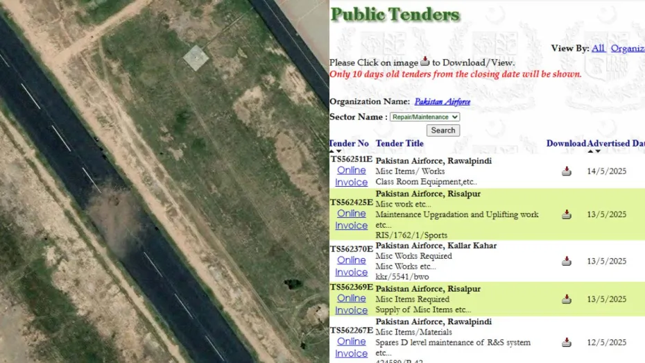 दरअसल, पाकिस्तान की एयरफोर्स ने उन सभी जगहों के लिए टेंडर निकाला है, जिसमें एयरबेस रिपेयर और मेनटेनेंस की बात कही गई है, आम दिनों में यह टेंडर निकलता तो शायद रखरखाव का हवाला दे दिया जाता लेकिन भारत के साथ तनाव के बीच भारी तादाद में निकाला गया टेंडर इस बात का साफ संकेत दे रहा है कि उनका एयरबेस तबाह हो चुका है और वे जल्द से जल्द इसकी रिपेयरिंग चाह रहे हैं जिससे अगर भारत कोई हमला करे तो व कुछ तो जवाब दे सकें। यह टेंडर पाकिस्तानी एयरफोर्स ने आनलाइन निकाला है, जिसे कोई भी देख सकता है।