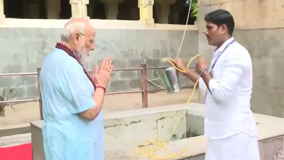 समुद्र में स्नान के बाद पीएम रामेश्वरम में श्री अरुल्मिगु रामनाथस्वामी मंदिर गए। यहां प्रधानमंत्री को कई तीर्थों के पूजित जल से स्नान कराया गया। इसके बाद प्रधानमंत्री ने मंदिर में विशेष पूजा-अर्चना भी की। इसका एक वीडियो सामने आया है। इसके साथ ही पीएम मोदी 'श्री रामायण पारायण' कार्यक्रम में भाग लिया।' इस कार्यक्रम में आठ अलग-अलग पारंपरिक मंडलियां संस्कृत, अवधी, कश्मीरी, गुरुमुखी, असमिया, बांग्ला, मैथिली और गुजराती में रामकथा (श्री राम की अयोध्या वापसी के प्रसंग का वर्णन) का पाठ किया गया। पीएम मोदी श्री अरुलमिगु रामनाथस्वामी मंदिर रामेश्वरम में प्रधानमंत्री भजन संध्या में भी शामिल हुए।
