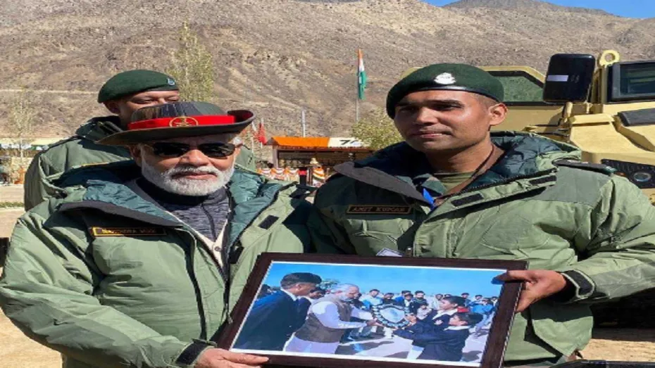 अधिकारियों ने बताया कि मेजर अमित ने गुजरात के बालाचड़ी में सैनिक स्कूल में मोदी से मुलाकात की थी। मोदी राज्य का मुख्यमंत्री बनने के तत्काल बाद अक्टूबर में उस स्कूल गए थे। एक अधिकारी ने कहा, ‘आज करगिल में दोनों फिर जब एक-दूसरे से मिले तो यह बहुत भावुक मुलाकात थी।‘ तस्वीर में अमित और एक अन्य छात्र मोदी से शील्ड लेते हुए दिख रहे हैं। साल 2014 में प्रधानमंत्री बनने के बाद से हर साल सशस्त्र बलों के कर्मियों के साथ दिवाली मनाने के अपने रिवाज का पालन करते हुए मोदी ने कारगिल में आज सैनिकों के साथ यह त्योहार मनाया है।
