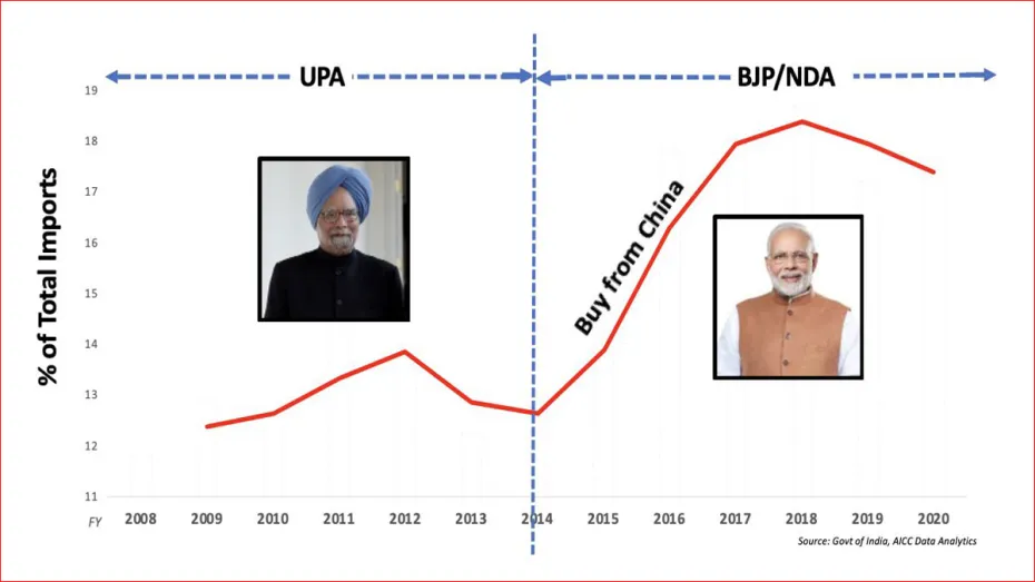 ग्राफ में दिखाया गया है कि 2008 से 2014 तक चीन से आयात 14 प्रतिशत से नीचे था, जबकि बीजेपी के नेतृत्व वाले एनडीए शासन के दौरान चीनी आयात 18 प्रतिशत से अधिक हो गया।