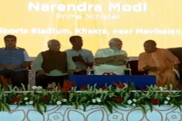 बागपत में प्रधानमंत्री नरेंद्र मोदी के साथ केंद्रीय परिवहन मंत्री नितिन गडकरी और यूपी के मुख्यमंत्री योगी आदित्यनाथ भी मौजूद।