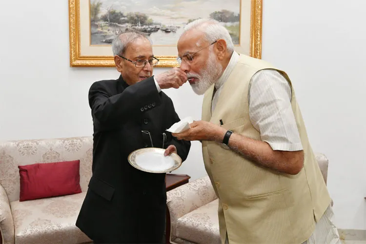 नई दिल्ली: प्रधानमंत्री नरेंद्र मोदी ने मंगलवार को पूर्व राष्ट्रपति प्रणव मुखर्जी से मुलाकात की। इस मुलाकात के दौरान दोनों की बीच काफी गर्मजोशी देखी गई। प्रणव ने खुद अपने हाथों से नरेंद्र मोदी का मुंह मीठा किया। आपको बता दें कि लोकसभा चुनावों में प्रधानमंत्री के नेतृत्व में भारतीय जनता पार्टी ने शानदार प्रदर्शन किया है। पार्टी ने अकेले अपने दम पर 542 में से 303 लोकसभा सीटों पर कब्जा जमाया है जबकि एनडीए का आंकड़ा 350 से भी ऊपर है।