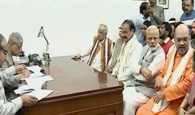 नई दिल्ली: उपराष्ट्रपति चुनाव में सत्तारूढ़ एनडीए की तरफ से वेंकैया नायडू ने मंगलवार को पीएम नरेंद्र मोदी, लालकृष्ण आडवाणी, मुरली मनोहर जोशी की मौजूदगी में तकरीबन सुबह 11.30 बजे नामांकन किया है। पर्चा भरने के बाद नायडू ने पीएम नरेंद्र मोदी और पार्टी अध्यक्ष अमित शाह का आभार व्यक्त करने के बाद कहा कि पार्टी ने मां की तरह ख्याल रखा। उधर कांग्रेस के नेतृत्व वाले यूपीए ने गोपाल कृष्ण गांधी को इस पद के लिए अपना उम्मीदवार बनाया है। वह भी मंगलवार को ही अपना नामांकन भरेंगे। ये भी पढ़ें: दलालों के चक्कर में न पड़ें 60 रुपए में बन जाता है ड्राइविंग लाइसेंस