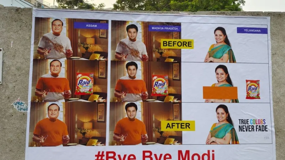 पोस्टर को देखकर ऐसा लगता है कि BRS यह संदेश देने की कोशिश कर रही है कि दूसरी पार्टियों में भ्रष्टाचार के आरोपी नेता अगर बीजेपी में आ जाते हैं तो उनके सारे गुनाह माफ हो जाते हैं। पोस्टर में असम के मुख्यमंत्री हिमंत विश्व शर्मा, केंद्रीय मंत्री ज्योतिरादित्य सिंधिया और पश्चिम बंगाल विधानसभा में विपक्ष के नेता सुवेंदु अधिकारी की तस्वीरें दिखाई गई हैं। बता दें कि हिमंत और सिंधिया पहले जहां कांग्रेस में थे, वहीं अधिकारी तृणमूल कांग्रेस के कद्दावर नेता थे। पोस्टर में जहां इन नेताओं के कपड़ों को 'Raid' के बाद सफेद से भगवा में बदलते दिखाया गया है, वहीं कविता के कपड़ों का रंग जस का तस है।