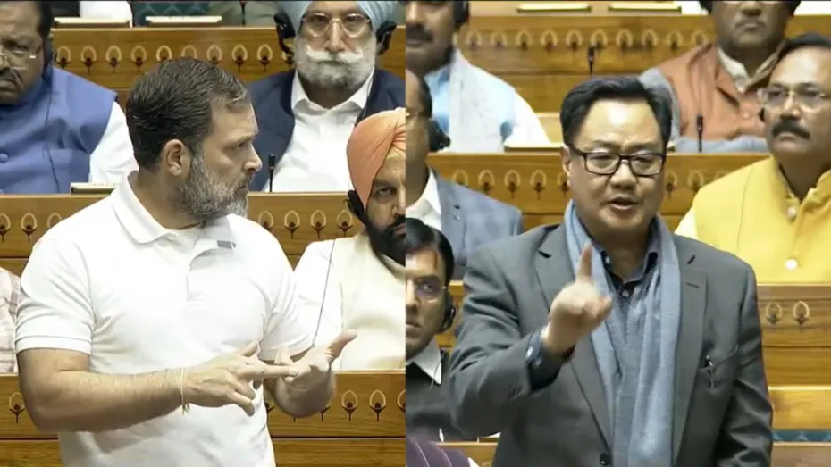 नई दिल्ली: लोकसभा में नेता प्रतिपक्ष ने आज 40 मिनट से अधिक की स्पीच दी। इस दौरान उन्होंने काफी आक्रामक रुख दिखाया। राहुल गांधी ने जातिगत जनगणना पर बात की। इसके अलावा भी उन्होंने कई अन्य मुद्दों को लोकसभा में उठाया। इस बीच कई बार राहुल गांधी ने ऐसी बातें भी बोल दीं, जिसका भाजपा के सांसदों ने विरोध जताया। इसमें किरेन रिजिजू ने राहुल गांधी को कई बार स्पीच के दौरान टोका। किरेन रिजिजू सहित एनडीए के अन्य सांसदों ने भी राहुल गांधी की स्पीच को लेकर कई जगहों पर आपत्ति जताई।