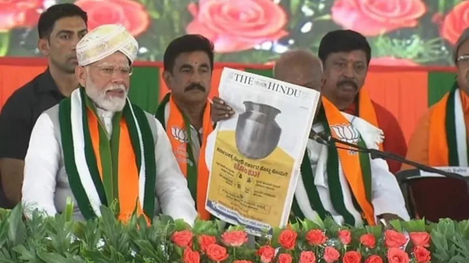 प्रधानमंत्री नरेंद्र मोदी की एक रैली में जनता दल (सेक्युलर) पार्टी के प्रमुख एचडी देवगौड़ा के बगल में बैठे हुए तस्वीर के बाद वाकयुद्ध छिड़ गया। देवगौड़ा अपने हाथ में एक अखबार लिए हुए थे, जिसके पहले पन्ने पर कांग्रेस का खाली लोटा विज्ञापन दिख रहा था। कर्नाटक के मुख्यमंत्री सिद्धारमैया ने एक्स पर पीएम मोदी और देवेगौड़ा की एक तस्वीर पोस्ट की। उन्होंने ट्वीट किया, "देवेगौड़ा कलाकार को कला दिखा रहे हैं।" उनके बाद कर्नाटक के डिप्टी सीएम डीके शिवकुमार ने माइक्रो-ब्लॉगिंग साइट पर उसी तस्वीर को "काव्य न्याय" शीर्षक के साथ शेयर किया।