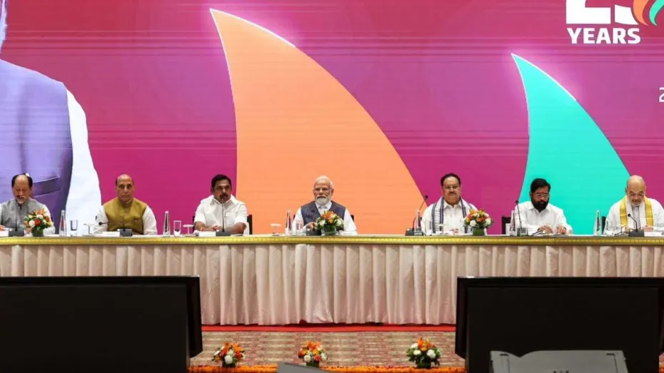 पीएम मोदी ने कहा-' एनडीए के 25 वर्षों की यात्रा के साथ एक और सुखद संयोग जुड़ा। देश आनेवाले 25 वर्षों में एक बड़े लक्ष्य के लिए कदम बढ़ा रहा है। लक्ष्य विकसित और आत्मनिर्भर भारत का है। कोटि-कोटि भारतीय नए संकल्प की ऊर्जा से भरे हुए हैं। इसमें एनडीए की बड़ी भूमिका है। एनडीए की भूमिका इसकी त्रिशक्ति है। भारत के विकास के लिए एनडीए को एक पॉजिटिव फोर्स के रूप में देखना चाहिए। हमारा एजेंडा, हमारी भावना और हमारा रास्ता पॉजिटिव है। सरकारें बहुमत से बनती हैं लेकिन देश सबके प्रयास से चलता है।'