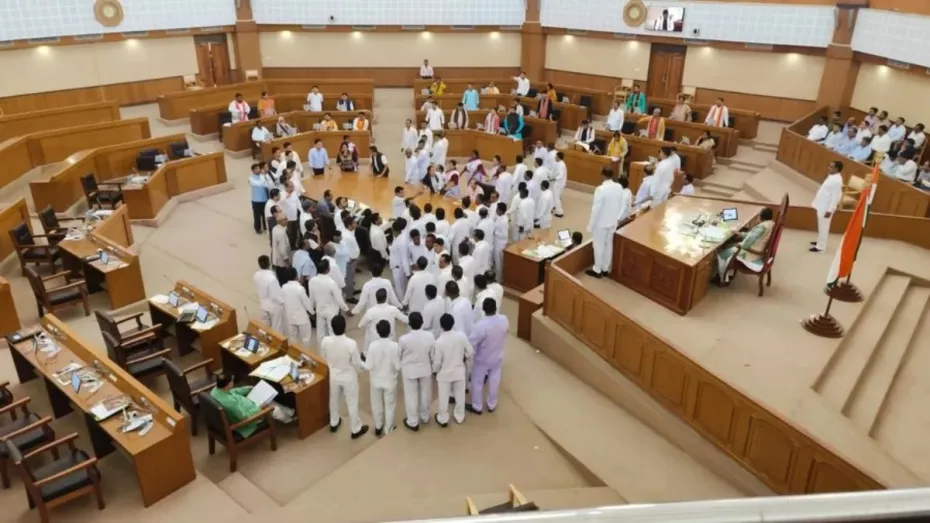 अगरतला: त्रिपुरा विधानसभा में आज जबरदस्त हंगामा हुआ। बजट सत्र के बीच विधायक आपस में भिड़ गए। सदन के अंदर बीजेपी और टिपरा मोथा पार्टी के विधायक हाथापाई करने लगे। इस दौरान मार्शल आए और बीच बचाव किया। विधानसभा की कार्यवाही में ‘‘बाधा डालने’’ को लेकर स्पीकर ने 5 विधायकों को सस्पेंड कर दिया है, जिसके विरोध में विपक्षी दलों ने सदन से बहिर्गमन किया।
