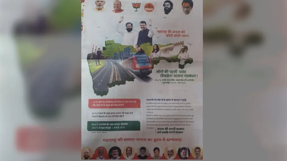 मुंबई: पिछले दो दिनों में महाराष्ट्र की राजनीति में एक विज्ञापन खूब चर्चा में बना हुआ है। यह विज्ञापन महाराष्ट्र सरकार की नींव हिला सकता है। यह विज्ञापन राज्य में एक नए विवाद को जन्म दे सकता है। दरअसल मंगलवार को प्रदेश के अखबारों में एक विज्ञापन छपता है, जिसमें मुख्यमंत्री एकनाथ शिंदे को उपमुख्यमंत्री देवेंद्र फडणवीस से ज्यादा लोकप्रिय बताया जाता है। यह विज्ञापन कल से ही चर्चा में बना हुआ था कि डैमेज कंट्रोल के लिए बुधवार को फिर से एक विज्ञापन छापा गया।