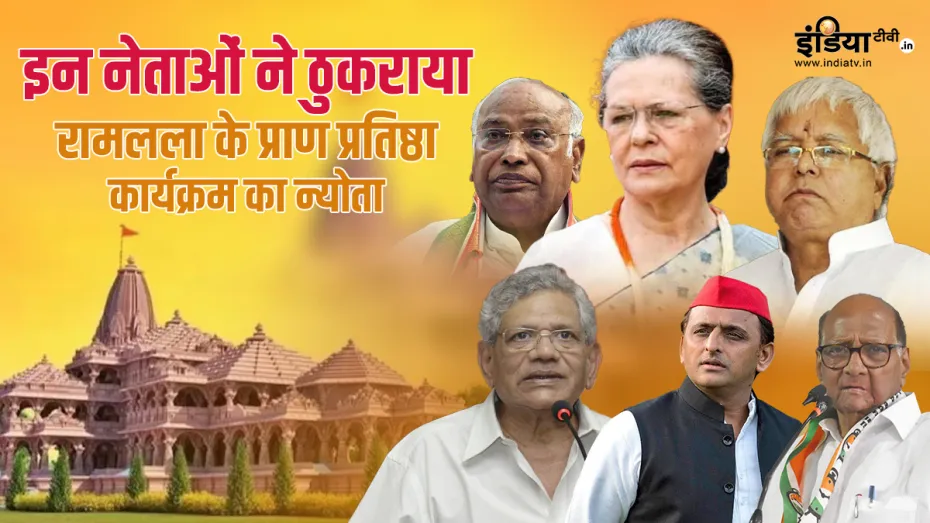 नई दिल्ली: अयोध्या में 22 जनवरी के लिए रामलला की प्राण प्रतिष्ठा की सभी तैयारियां पूरी हो चुकी हैं। इस कार्यक्रम में हिस्सा लेने के लिए हजारों लोग अयोध्या पहुंच रहे हैं। देश के विभिन्न वर्गों से आने वाले लोगों को प्राण प्रतिष्ठा का न्योता दिया गया था। जिसमें से हजारों लोगों ने इस न्योते को स्वीकार कर लिया लेकिन कुछ विपक्षी दलों के नेताओं ने निमंत्रण को ठुकरा दिया।