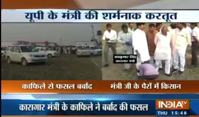 जालौन (उत्तर प्रदेश): एक तरफ योगी सरकार किसानों के कर्ज माफ कर रही है तो दूसरी तरफ सरकार के ही मंत्री किसानों की फसल बर्बाद करने में लगे हैं। जालौन के उरई से एक ऐसी ही तस्वीर सामने आई जहां यूपी के कारागार मंत्री जय कुमार सिंह एक गौशाला का शिलान्यास करने आये थे। उनके काफिले में आई गाड़ियों ने एक दलित किसान की फसल को बर्बाद कर दिया। मंत्री के काफिले की कारें दनदनाते हुए खेत में घुस गई, जिससे खेत में लगी सरसों की फसल नष्ट हो गई।