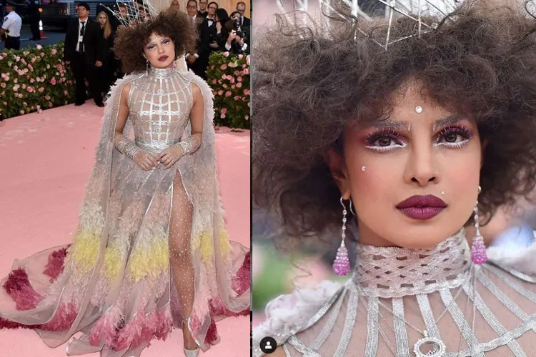 मेट गाला 2019 में पहुंचीं प्रियंका चोपड़ा ने Dior का सॉफ्ट पेस्टल गाउन पहने नजर आईं। थाई हाई स्लिट इस गाउन को उन्होंने शिमरी टाइट्स पहने थे। उनके इस गाउन में पिंक और येलो फेदर लगे थे। उनके गाउन के अलावा उनका हेयरस्टाइल और क्राउन भी काफी आकर्षक था। इसके साथ उनके लुक को पूरा किया उनके अट्रैक्टिव मेकअप ने।