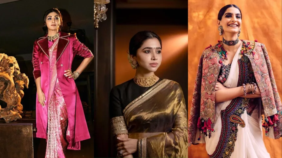 साड़ी को लॉन्ग जैकेट के साथ करें पेयर