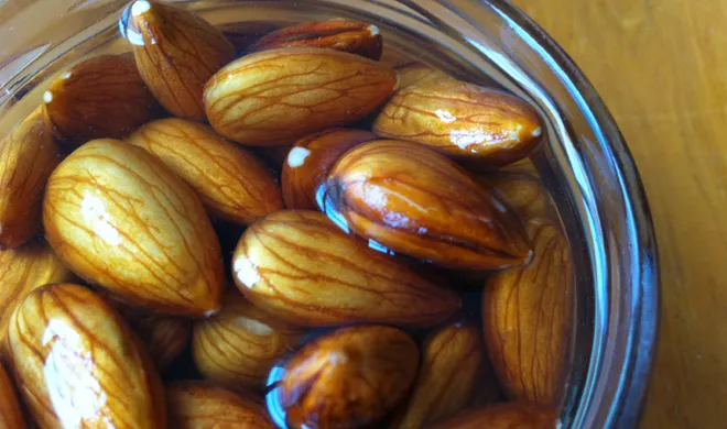 बादाम आवश्यक विटामिन और मिनरल जैसे विटामिन ई, जिंक, कैल्शियम और ओमेगा -3 फैटी एसिड से भरपूर होता है। लेकिन इन सभी पोषक तत्वों को अवशोषित करने के लिए, बादाम को खाने से पहले रात में भिगोना चाहिए। ऐसा इसलिए क्योंकि बादाम के भूरे रंग के छिलके में टैनीन होता है जो पोषक तत्वों के अवशोषण को रोकता है।
