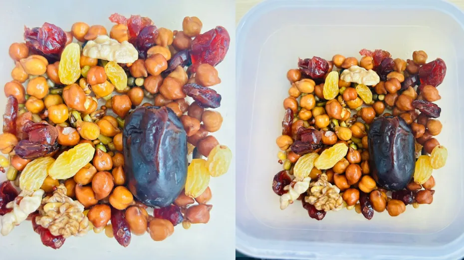 दूसरा स्टेप- सुबह चना, मूंग, मूंगफली और मेथी को 1-2 बार पानी से धो लें। अब बादाम और अखरोट को भी धो लें। पूरा पानी निकाल दें। अब इसमें पानी से निकाली हुई किशमिश भी डाल दें। किशमिश के पानी को ऐसे ही पी लें। अब आप इसमें 2 खजूर डालें और थोड़ी बैरीज मिला दें। आप चाहें तो फल भी डाल सकते हैं।