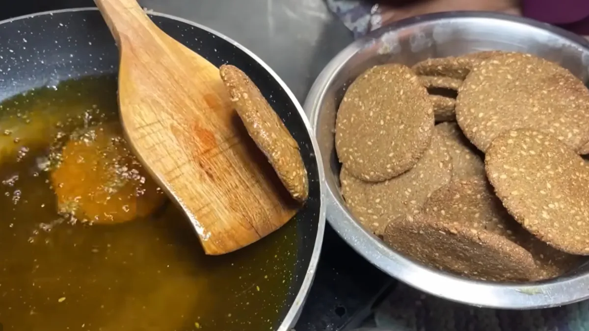 तीसरा स्टेप- अब बाजरा के आटे में थोड़ा-थोड़ा करके गुड़ वाला घोल डालते हुए नरम आटा गूंथ लें। आपको पूरी जैसा आटा गूंथकर तैयार करना है। ध्यान रखें आटा ज्यादा पतला नहीं करना है। पुआ के आटे को 5 मिनट सेट होने के लिए ऐसे ही छोड़ दें। इसके बाद रोटी जितनी लोई तोड़कर पुआ को हथेली से बढ़ा लें। पुआ को गोल टिक्की जैसी शेप में बनाना है। लेकिन ध्यान रखें कि बीच से बहुत ज्यादा मोटा नहीं होना चाहिए।