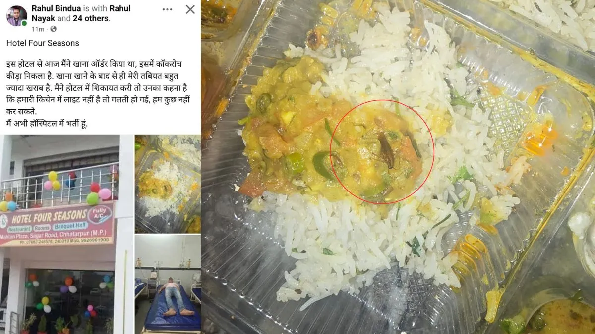 दरअसल, पूरा मामला छतरपुर के सीताराम कॉलोनी का है। यहां के रहने वाले एक शख्स राहुल बिंदुआ ने होटल के खाने मे कॉकरोच होने की बात कही। वहीं खाने में कॉकरोच निकलने से युवक की हालत बिगड़ गई, जिसके बाद उसे जिला अस्पताल में भर्ती कराया गया। सीताराम कॉलोनी निवासी राहुल बिंदुआ ने बताया कि उसने सागर रोड स्थित होटल फोर सीजन से स्विगी के माध्यम से ऑनलाइन खाना ऑर्डर करके मंगवाया था। उसने खाने में मिक्स वेज सब्जी, दाल, चावल, रोटी, रायता, बटर पनीर ऑर्डर किया था।