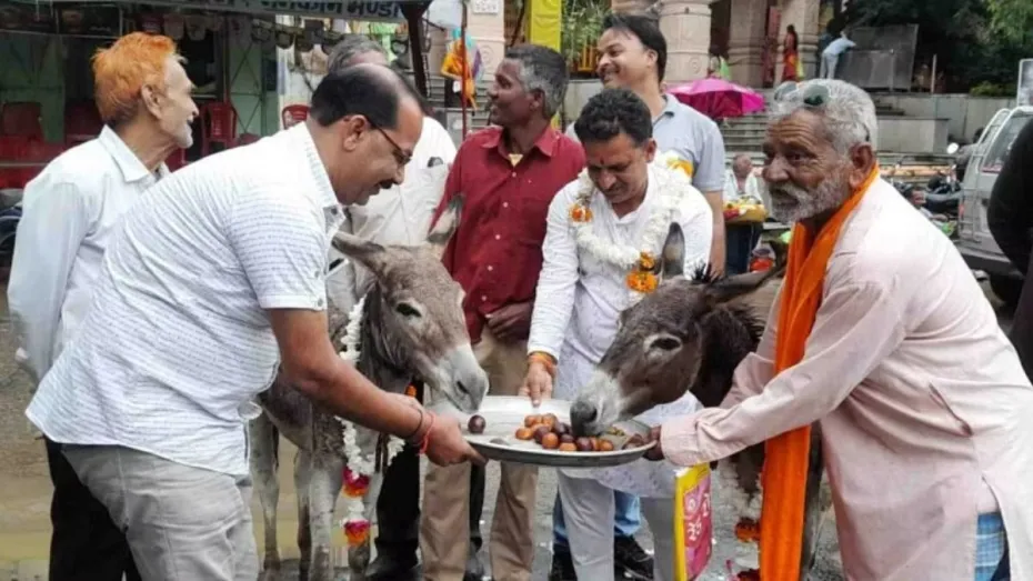 मंदसौर: मध्य प्रदेश में के मंदसौर जिला एक बार फिर से चर्चा में है। इस बार यहां किसान नहीं बल्कि गधों को लेकर एक वीडियो चर्चा बटोर रहा है। सोशल मीडिया पर वायरल हो रहे एक वीडियो में देखा जा रहा है कि कुछ लोग दो गधों को एक परात में गुलाब जामुन खिला रहे हैं। इसके पीछे वजह भी बड़ी रोचक बताई जा रही है। कहा जा रहा है कि मंदसौर में बारिश के लिए यह टोटका किया गया।