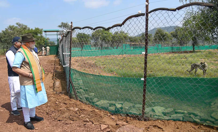 भारत में चीतों को विलुप्त घोषित किए जाने के सात दशक बाद उन्हें देश में फिर से बसाने की परियोजना के तहत नामीबिया से आठ चीते शनिवार सुबह कूनो नेशनल पार्क में लाए गए हैं। पहले इन्हें विशेष विमान से ग्वालियर हवाई अड्डे और फिर हेलीकॉप्टरों से श्योपुर जिले में स्थित कूनो नेशनल पार्क लाया गया। शनिवार को अपना 72 वां जन्मदिन मना रहे प्रधानमंत्री मोदी ने चीतों को पार्क के एक विशेष बाड़े में छोड़ा था। चीते धीरे धीरे पिंजड़ों से बाहर आते दिखे। इस मौके पर मोदी अपने पेशेवर कैमरे से चीतों की तस्वीरें लेते हुए भी दिखाई दिए थे।