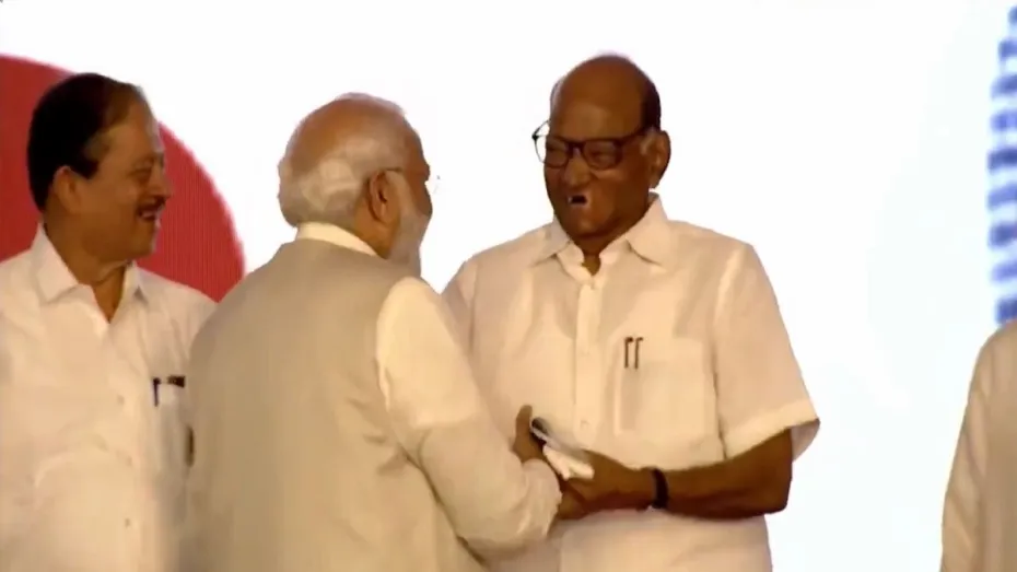 प्रधानमंत्री नरेंद्र मोदी आज महाराष्ट्र दौरे पर है जहां उनको लोकमान्य तिलक राष्ट्रीय पुरस्कार से सम्मानित किया गया लेकिन इस कार्यक्रम ने सियासी पारा हाई कर दिया है और वजह है कार्यक्रम का मंच। एनसीपी में टूट के बाद पहली बार पीएम मोदी और शरद पवार एक मंच पर दिखाई दिए। साथ में थे अजित पवार, देवेंद्र फडणवीस और सीएम एकनाथ शिंदे। पुणे के मंच पर जब एनसीपी चीफ शरद पवार और पीएम मोदी मिले तो नजारा देख हर कोई हैरान रह गया। कार्यक्रम में मोदी से शरद पवार ऐसी गर्मजोशी से मिले कि दोनों को देख फिर से बातें होने लगी हैं। मोदी से मिलकर पवार खिलखिलाकर हंस रहे थे। उन्होंने मुस्कुराकर प्रधानमंत्री को थपकी भी दी।