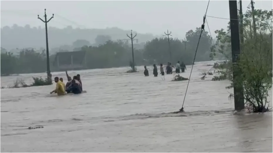 महाराष्ट्र के अहिल्यानगर के खडकी गांव से एक वीडियो सामने आया है। वीडियो में साफ देखा जा सकता है कि लड़कियां अपनी जान बचाने के लिए एक ट्रॉली पर बैठी हैं और चारों तरफ पानी है। हालांकि जब एनडीआरएफ की टीम मौके पर नहीं पहुंच सकी तो गांव के ही युवाओं ने अपनी जान को जोखिम में डालकर रस्सियों के सहारे लोगों को रेस्क्यू किया और इस दौरान एनडीआरएफ की टीम ट्रैफिक जाम में फंस गई थी। रेस्क्यू टीम ने पूरी कहानी बताई कि कैसे 15 युवाओं की टीम ने 3 बेटियों की जान बचाई। यहां नदी के जलस्तर में हो रही बढ़ोत्तरी के कारण तीन लड़कियां पानी के बीच घिर गईं थीं।