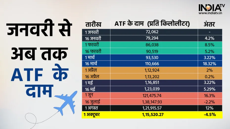 इस साल 16 मार्च को कंपनियों ने ATF में सबसे ज्यादा बढ़ोतरी की थी। 1 मार्च को जहां एटीएफ की कीमत 93,530 प्रति किलोलीटर, 16 मार्च को 18.3 फीसदी की बढ़ोत्तरी के बाद पहली बार एक लाख के पार पहुंचते हुए 110,666 प्रति किलोलीटर हो गई। वहीं अप्रैल और मई की बढ़ोत्तरी के बाद कीमतें 1.23 लाख प्रति किलोलीटर तक पहुंच गईं।