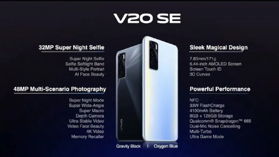 वीवो वी20एसई में कंपनी सेल्फी कैमरा में रात में भी अच्छी फोटो खींचने का फीचर दे रही है। वी20एसई में 8जीबी रैम, 128 जीबी इंटरनल मेमोरी और 4100 एमएएच की बैटरी है। फोन में पीछे की तरफ 48 मेगापिक्सल, आठ मेगापिक्सल और दो मेगापिक्सल के तीन कैमरे हैं। इसकी कीमत 20,990 रुपये है।