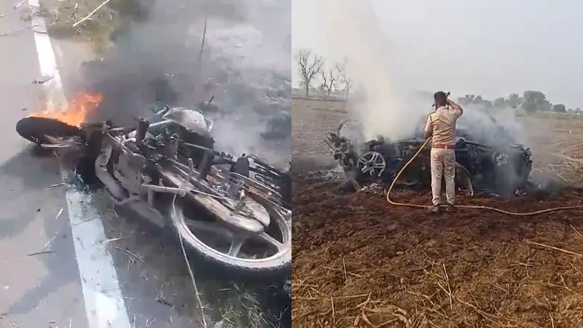 राजस्थान के भरतपुर जिले में तेज रफ्तार थार ने एक मोटर साइकिल को टक्कर मार दी। थार की टक्कर से मोटर साइकिल सवार पर सवार एक ही परिवार के चार लोगों की मौत हो गई। बाइक में पति-पत्नी अपने दो बच्चों के साथ जा रहे थे। इसी बीच कार ने उन्हें जोरदार टक्कर मार गी। थार गाड़ी की टक्कर इतनी तेज थी कि टक्कर के बाद मोटरसाइकिल में आग लग गई। एक ही परिवार के चार लोगों की मौत से गुस्साई भीड़ ने थार जीप में भी आग लगा दी।