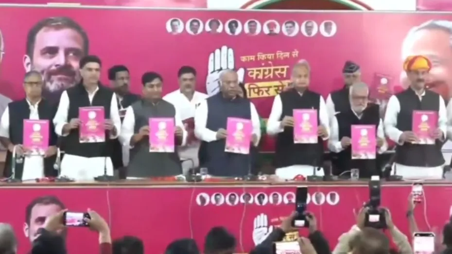 जयपुर: राजस्थान विधानसभा चुनावों के लिए कांग्रेस ने अपना घोषणापत्र मंगलवार को जारी कर दिया है। कांग्रेस के घोषणापत्र को पार्टी के राष्ट्रीय अध्यक्ष मल्लिकार्जुन खरगे ने मुख्यमंत्री अशोक गहलोत एवं अन्य बड़े नेताओं की मौजूदगी में जारी किया। घोषणापत्र में कांग्रेस द्वारा जनता से कई बड़े वादे किए गए हैं जिनमें 10 लाख रोजगार सृजित करना, 4 लाख नई सरकारी नौकरियां, और महिलाओं की सुरक्षा के लिए सार्वजनिक स्थानों पर सीसीटीवी कैमरे लगाए जाने की बातें प्रमुख हैं।