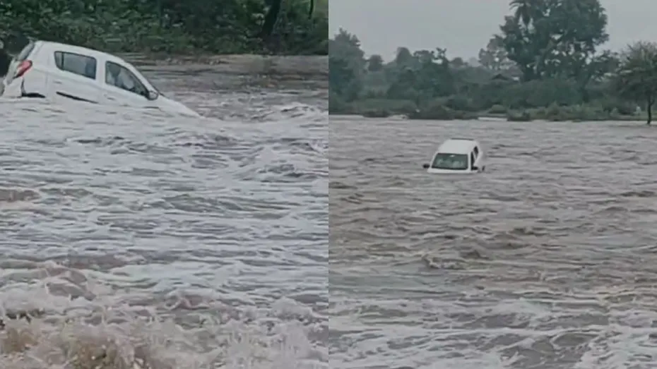बांसवाड़ा जिले के सज्जनगढ़ में झमाझम बारिश के चलते नदी उफान पर है। राठधनराज के गांव जकोडिया के पास एक कार नदी में गिर गई। उफनती नदी में कार गिरने से उसमें सवार तीन लोगों की जिंदगी मुश्किल में घिर गई। ग्रामीणों ने हिम्मत जुटाकर रस्सियां डाली और कार को नदी से बाहर निकाला। इससे तीन लोगों की जान बच गई।