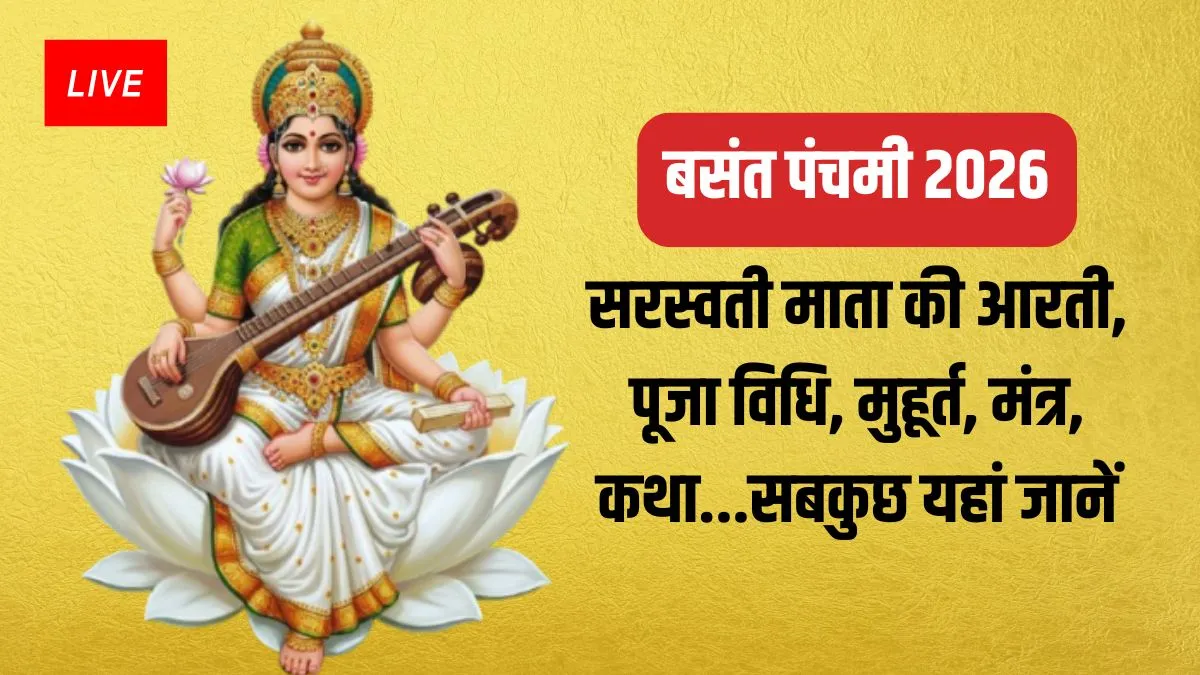 Basant Panchami 2026 Saraswati Mata Ki Aarti Live: बसंत पंचमी सनातन धर्म का एक प्रमुख त्योहार है जो हर साल माघ महीने में मनाया जाता है। इस दिन विद्या की देवी मां सरस्वती की पूजा-अर्चना की जाती है। इस दिन को कहीं श्री पंचमी तो कहीं सरस्वती पूजा के नाम से भी जाना जाता है। इस दिन घरों और मंदिरों में ही नहीं बल्कि स्कूलों में भी मां सरस्वती की पूजा होती है। इस साल बसंत पंचमी का त्योहार 23 जनवरी को मनाया जाएगा। यहां आप जानेंगे बसंत पंचमी की आरती, पूजा का शुभ मुहूर्त, व्रत कथा और भोग समेत सभी जरूरी बातें।