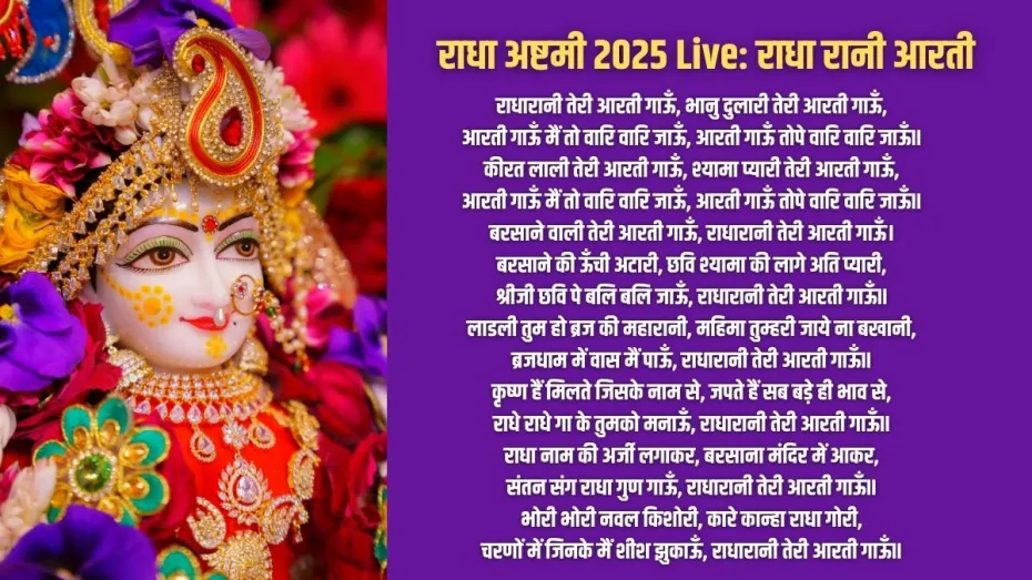 Radha Rani Ki Aarti Lyrics Pdf, (राधी जी की आरती: राधारानी तेरी आरती गाऊं, भानु दुलारी तेरी आरती गाऊं): हर साल भाद्रपद शुक्ल पक्ष की अष्टमी तिथि को राधा अष्टमी मनाई जाती है। ये त्योहार देवी राधा के जन्मोत्सव के रूप में मनाया जाता है। इस दिन भक्तगण व्रत का पालन करते हैं और मध्याह्नकाल में राधा रानी की विधि विधान पूजा करते हैं। इस साल राधा अष्टमी पूजा का शुभ मुहूर्त 31 अगस्त 2025 की सुबह 11:05 से दोपहर 01:38 बजे तक रहेगा। पूजा के समय राधा रानी की आरती को करना न भूलें। यहां आप देखेंगे राधा अष्टमी की आरती के लिरिक्स।