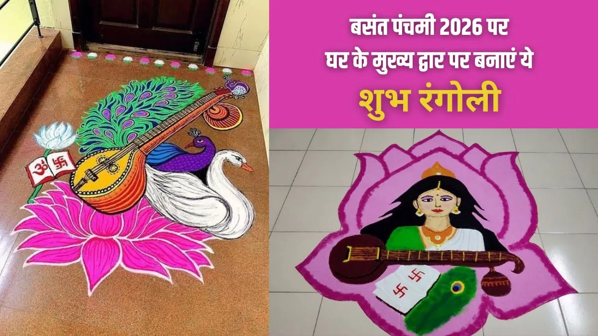 Basant Panchami Rangoli 2026 (सरस्वती पूजा रंगोली): बसंत पंचमी यानी सरस्वती पूजा के दिन रंगोली बनाने का विशेष महत्व माना जाता है। इस दिन घरों ही नहीं बल्कि स्कूलों में भी तरह-तरह की रंग-बिरंगी रंगोली बनाई जाती है। कहते हैं रंगोली बनाने से माता सरस्वती की विशेष कृपा प्राप्त होती है। शास्त्रों के अनुसार रंगोली केवल सजावट का साधन नहीं है बल्कि यह सकारात्मक ऊर्जा को आमंत्रित करने का भी एक माध्यम है। आइए जानते हैं इस बसंत पंचमी कैसी रंगोली बनाकर आप ज्ञान और संगीत की देवी की विशेष कृपा प्राप्त कर सकते हैं।