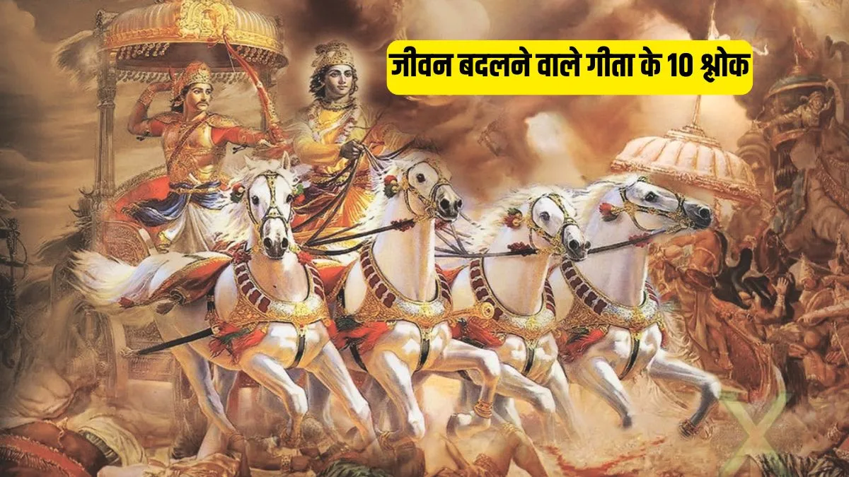 Bhagwan Geeta Sanskrit Shlok: भगवद गीता सही रास्ते पर चलने और अपने कर्मों पर ध्यान केंद्रित करने की सीख देती है। कहते हैं जब महाभारत युद्ध से पहले अर्जुन का मन विचलित हो गया था और वे युद्ध करने से पीछे हटने लगे थे तब श्रीकृष्ण भगवान ने उन्हें सही राह दिखाई। भगवान कृ्ष्ण ने अर्जुन को जीवन, कर्तव्य, धर्म, कर्म और मोक्ष से जुड़ी कई शिक्षाएं दीं। जो हमें गीता में श्लोकों के रूप में देखने को मिलती है। यहां हम आपको बताएंगे गीता के उन खास श्लोकों के बारे में जो आपका जीवन बदल देंगे।