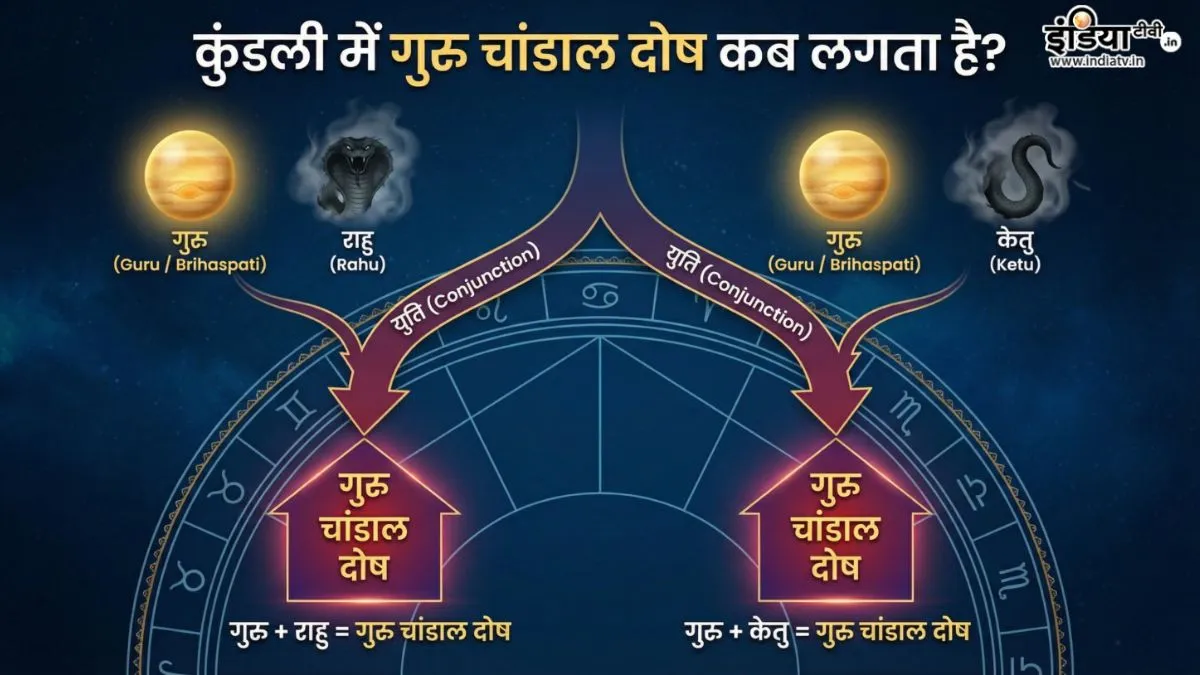 Guru Chandal Dosh Kya Hai: ज्योतिष शास्त्र में गुरु चांडाल दोष को अत्यंत अशुभ और हानिकारक योग माना गया है। जब किसी जातक की कुंडली में यह दोष बनता है, तो उसके करियर और पारिवारिक खुशियों पर नकारात्मक असर पड़ता है। इस दोष के कारण व्यक्ति को मानसिक तनाव, आर्थिक नुकसान और मान-सम्मान में कमी का सामना करना पड़ता है। कई बार मेहनत के बावजूद सफलता हाथ नहीं लगती। आइए जानते हैं कि आखिर गुरु चांडाल दोष क्या है? इसके लक्षण और निवारण उपायों के बारे में भी बात करेंगे।