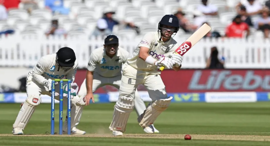 दिन की शुरूआत दो विकेट पर 111 रन से करने वाले इंग्लैंड को चौथे दिन की पहली ही गेंद पर काइल जैमीसन (85 पर तीन विकेट) ने कप्तान जो रूट को पहले स्लिप में खड़े रोस टेलर के हाथों कैच कराकर पवेलियन भेजा। साउदी ने इसके बाद 140 रन के स्कोर पर इंग्लैंड को तीन झटके दिये। उन्होंने ओली पोप (22) को आउट करने के बाद डैन लॉरेंस (शून्य) और विकेटकीपर जेम्स ब्रासे (शून्य) को खाता खेलो बगैर आउट किया।
