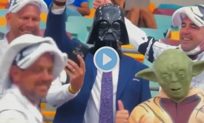 दरअसल, चौथे टेस्ट मैच के दूसरे दिन कुछ फैन्स स्टेडियम में स्टार वार्स सिनेमा के किरदारों के मास्क पहने नजर आए थे। इन फैन्स से प्रभावित होकर ऑस्ट्रेलिया के पूर्व दिग्गज एलन बॉर्डर उनसे मिलने ना सिर्फ स्टैंड तक गए बल्कि वो खुद भी इस सिनेमा के एक किरदार का मास्क पहने नजर आए। बॉर्डर स्टार वार्स सिनेमा के विलेन किरदार डार्थ वेंडर का मास्क पहने नजर आए। जिसका विडियो भी सोशल मीडिया पर आया और तेजी से वायरल हो रहा है। हलांकि ये विडियो दूसरे दिन के खेल का है जबकि अभी तीसरे दिन का खेल जारी है।