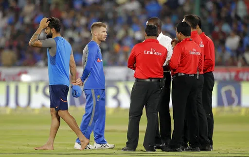 - मैदान के निरीक्षण के बाद अंपायर्स और मैच रैफ़री रिची रिचर्डसन ने कोहली और वॉर्नर से बीत की. 7:45 पर पिर मैदान का निरीक्षण होगा.
