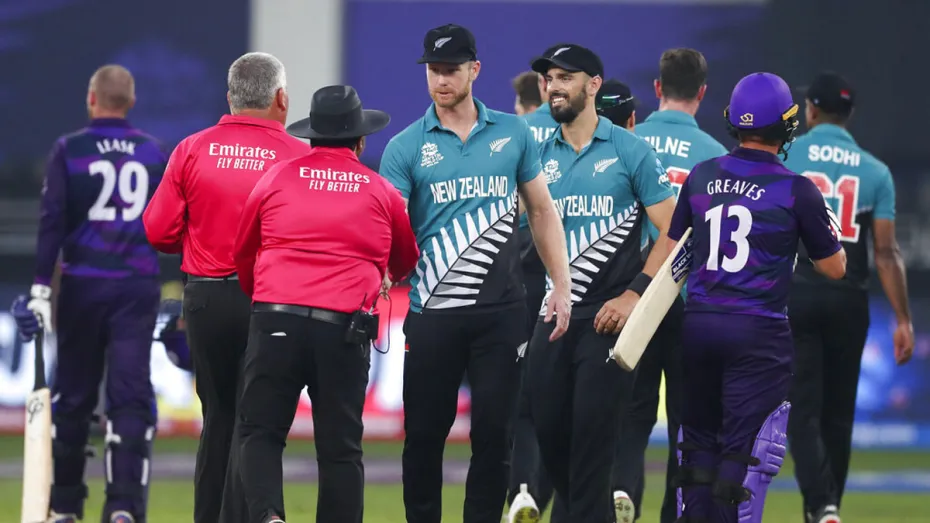 आईसीसी टी20 वर्ल्ड कप में बुधवार को सुपर 12 में यहां दुबई इंटरनेशनल स्टेडियम में खेले जा रहे मैच में न्यूजीलैंड ने स्कॉटलैंड को 16 रनों से मात दी। टॉस हारकर पहले बल्लेबाजी करते हुए न्यूजीलैंड ने 173 रनों का लक्ष्य दिया था। इसके जवाब में रनों का पीछा करने उतरी स्कॉटलैंड की टीम 20 ओवरों में 5 विकेट के नुकसान पर 156 रन ही बना सकी। टीम की ओर से माइकल लीस्क (42) ने सबसे ज्यादा रन बनाए। न्यूजीलैंड की ओर से ट्रेंट बोल्ट और ईश सोढ़ी को दो-दो सफलताएं मिली। वहीं, टिम साउदी को एक विकेट मिला।