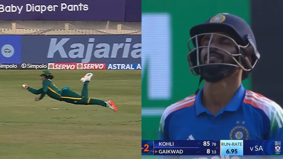 भारतीय टीम के खिलाफ 27वां ओवर ओटनील बार्टमैन ने फेंका और इस ओवर की तीसरी गेंद को रुतुराज गायकवाड़ ने खेला। वह गेंद को ड्राइव करना चाहते थे। इसके बाद गेंद बल्ले से लगकर बैकवर्ड पॉइंट की तरफ गई, जहां युवा डेवाल्ड ब्रेविस फील्डिंग कर रहे थे। इसके बाद उन्होंने सुपरमैन की तरफ हवा में छलांग लगाई और एक हाथ से हैरतअंगेज कैच पकड़ा। उनका ये कैच देखकर पूरा स्टेडियम हैरान रह गया।